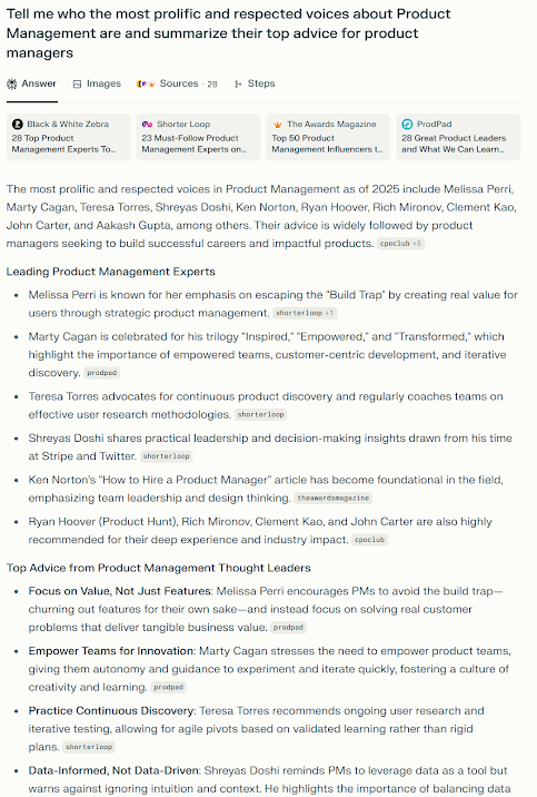 Of course, if you just want extended search, like “Tell me who the most prolific and respected voices about product management are and summarize their top advice for product managers” you can use something like Perplexity: