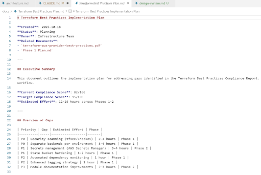 The other thing that I’ve done in my testing is to download best practice docs and ask Claude to compare our state to best practice. I then take that output and use it to stack rank epics to fix those issues. Here’s the plan Claude developed from the AWS Terraform best practice document: