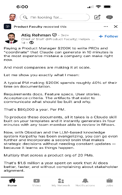 And this is the bottleneck problem. The process we used to use to drive features into production assumed that engineering resources were scarce. They were designed to protect the engineering team from writing "throwaway" code. They were designed to drive understanding and certainty BEFORE YOU WROTE CODE. Which made sense when you had to write the code by hand. But today? Today you only write code by hand if this is your hobby. If you actually have to run a business, you have AI write the code because it's so much faster. Is it better? No, not really. But it's so much faster that we will accept the lower quality. For this reason, all those processes that we spent time and effort developing need to be re-evaluated. Some of them like CI/CD still work. But some of them, like writing detailed PRDs are probably no longer needed.