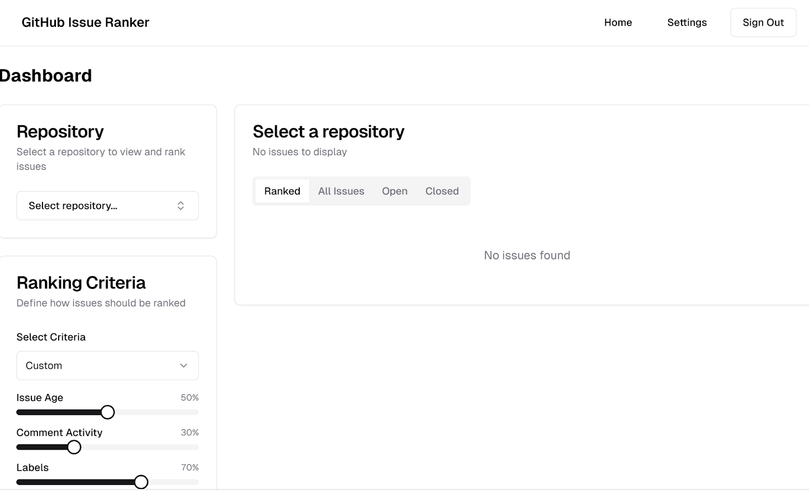 This time I used v0 from Vercel. I used the same one-shot prompt, “Build an app that stack ranks issues in a GitHub repo based on user-defined criteria.” Unlike Replit, v0 assumed I was building a SaaS application and gave me a login screen: